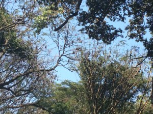 In the tree beside the river, thousands of fruit bats were roosting, hung upside down from branches. They truly live up to their other name “flying foxes”, with wingspans up to a metre across. They make an unpleasant squeal that sounds like a pig, not the squeak from British bats.