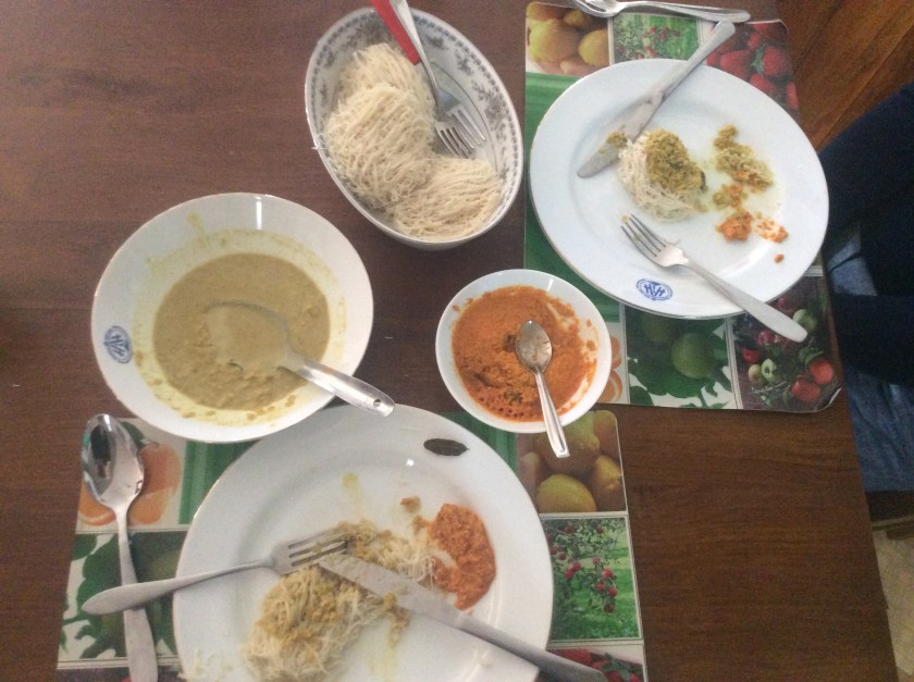 Our sleep last night was disturbed by our son Tommy pocket-dialing us at 11.30, and then again at 5am. When I answered the phone, he couldn’t hear me. My sleep disturbed, but it was his phone bill that suffered! We ate string hoppers, dhal, coconut chutney and an omelette for breakfast this morning, it was a very moving experience.