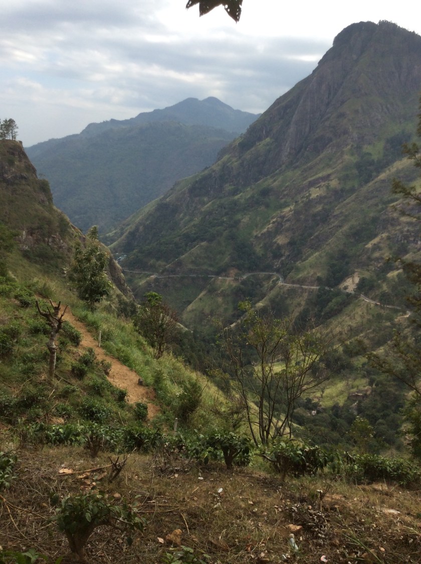 The Richmond Inn was one of the better places we have stayed in, and the staff were friendly and helpful. But we had exhausted what there was to do in Nuwara Eliya, so it was time to hitch up th wagon again.There were no train tickets available to Ella today, so we took a bus . Our red Lanka Ashock Leyland bus was packed, but we got a seat together next to the open door. It was chilly because the town is at over 1800 metres, but we got a great view of the beautiful mountain countryside. The mountains are very high and steep, and the bus hangs onto the side, constantly going round bends and gradually losing altitude. Vegetables are the main crop here, and the hillsides are terraced to increase growing space. There are terraces of onions, red beet and stuff I don’t recognise. At every village passengers get on and off, and the conductor moves up and down the bus collecting fares.