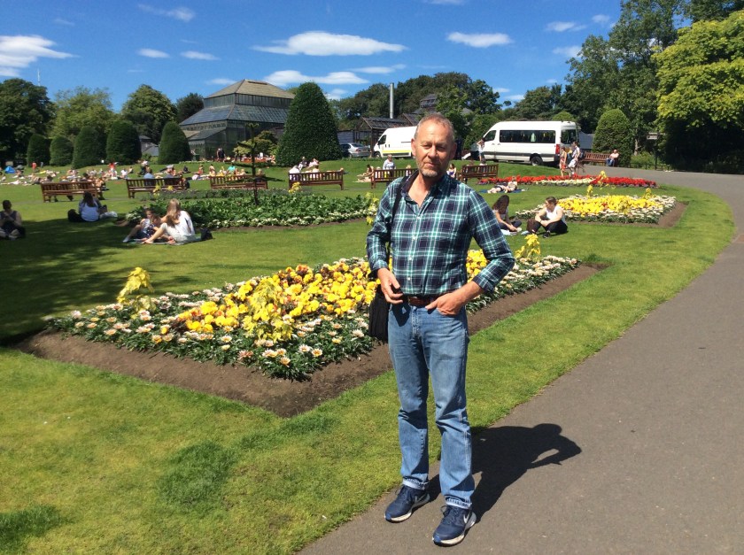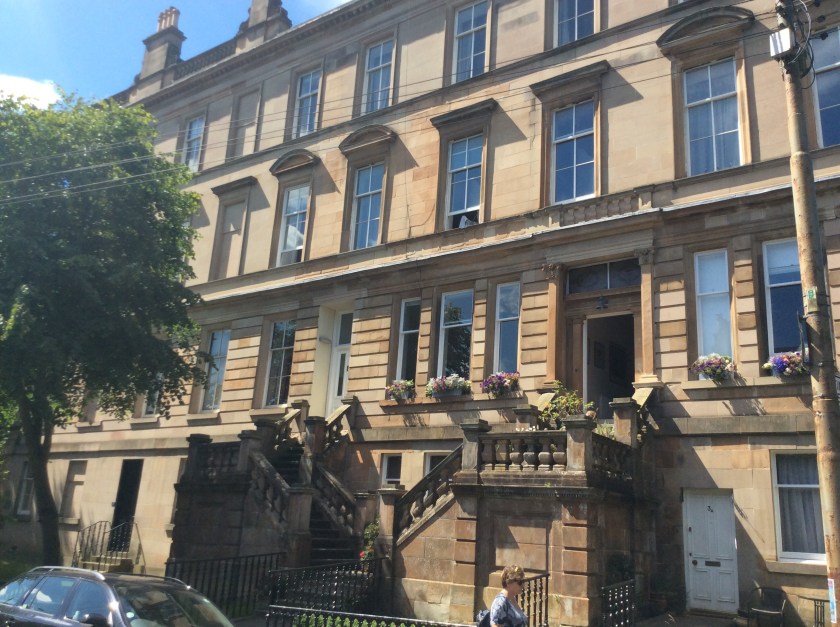 We arrived in Glasgow dead on time at 11.59, and got a cab to our AirBnB in Hamilton Park Avenue in the West End. Our room is huge with ceilings about ten feet high and massive sash windows.