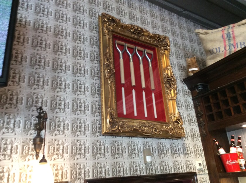 The museum closed at 5pm, and we took the subway, Glasgow's underground railway. It's a single circular line, one hundred and twenty years old, and it's £1.65 for a single, not bad. We got off at Kelvinbridge Station close to our accommodation, and found a pub called the Bellhaven Dunbar for a well deserved sit down and a drink. I liked the framed fork handles.