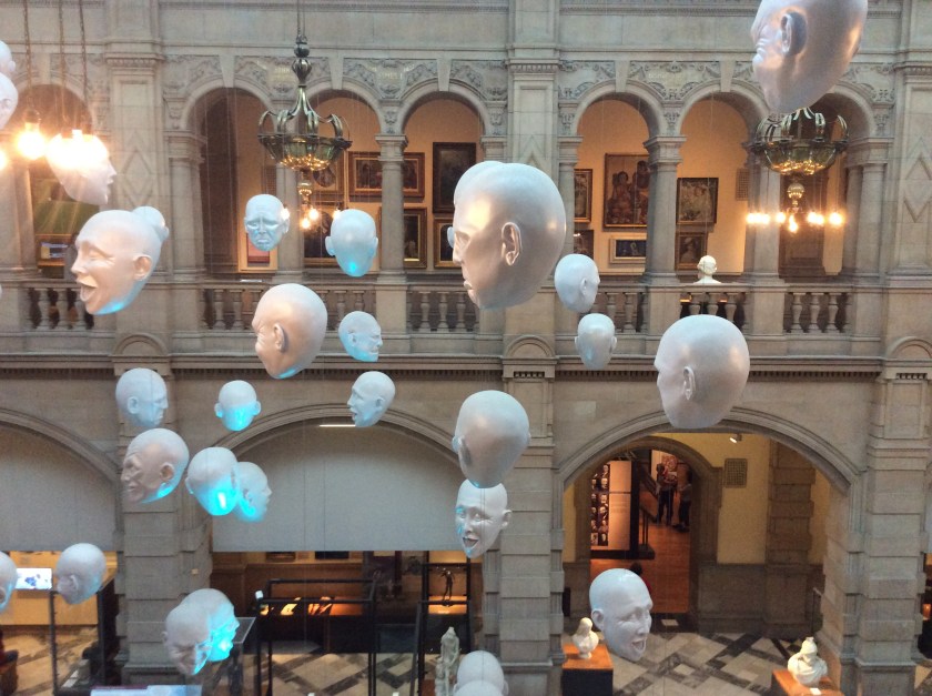 Half a mile down the hill is Kelvingrove Museum, a magnificent palace of Victorian Gothic and a fabulous place to visit. The building is reminiscent of the V&A and the Natural History Museum, a huge an beautiful exhibition of art, taxidermy and with bizarre sculpted heads suspended from the ceiling. There is more CRM stuff and some gorgeous paintings by Scottish Colourists, who were influenced by the French Impressionists. All that culture makes one peckish, and just as I was buying sandwiches the awesome pipe organ started playing some Handel (or possibly Bach). So we sat and munched our sarnies while being entertained by the organist who played with his feet as well as his hands, a TV screen showed his feet in action.