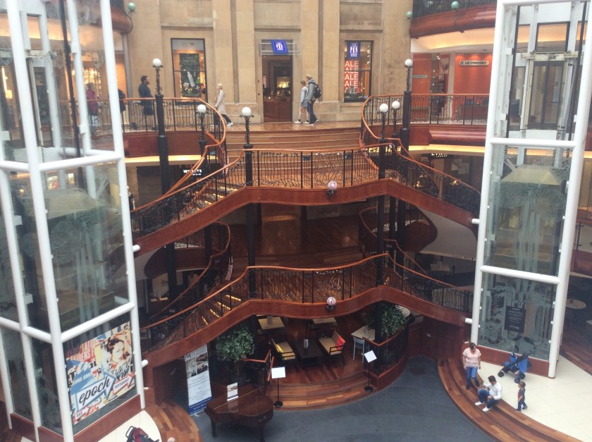 Glasgow is set out on a grid like American cities, so it's quite easy to get around. Buchanan Street is like a pedestrianised Oxford Street, lots of upmarket shops in big sandstone buildings. Princes Square is a very pretty shopping centre with lovely art nouveau stairs.