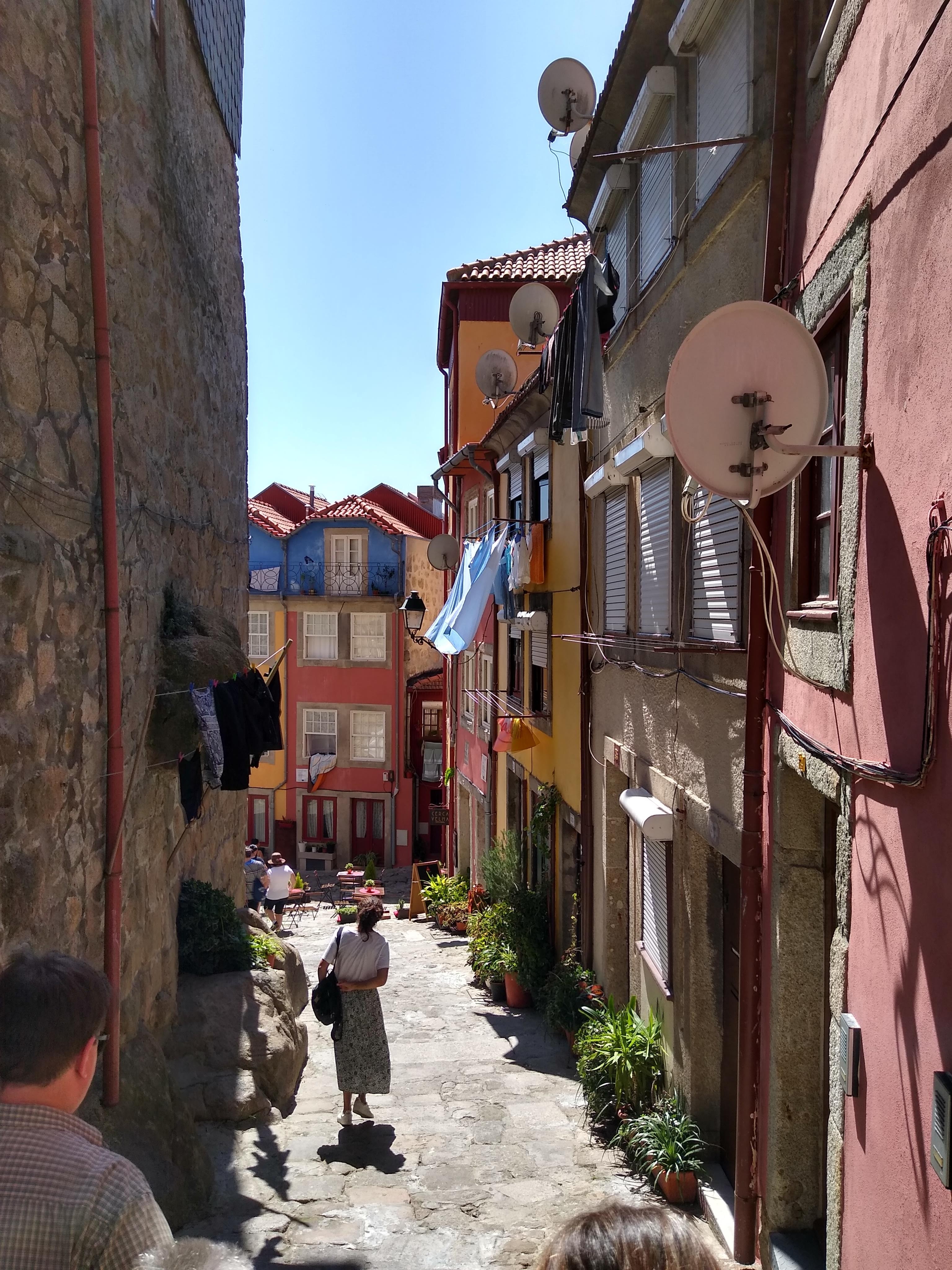 The 500 bus took us back to the city centre, and we met up with a group of people for a walking tour of Porto with Carlotta. She is a late twenty -something history graduate, who knows everything about her home town. The walk was all within the confines of the old city walls which have now gone, except for a few remnants. Below the Gothic cathedral (the Se) there are narrow medieval streets which are gradually being improved and gentrified. But there is still washing hanging from upper stories and even a big paddling pool in the street for hot neighbourhood kids!