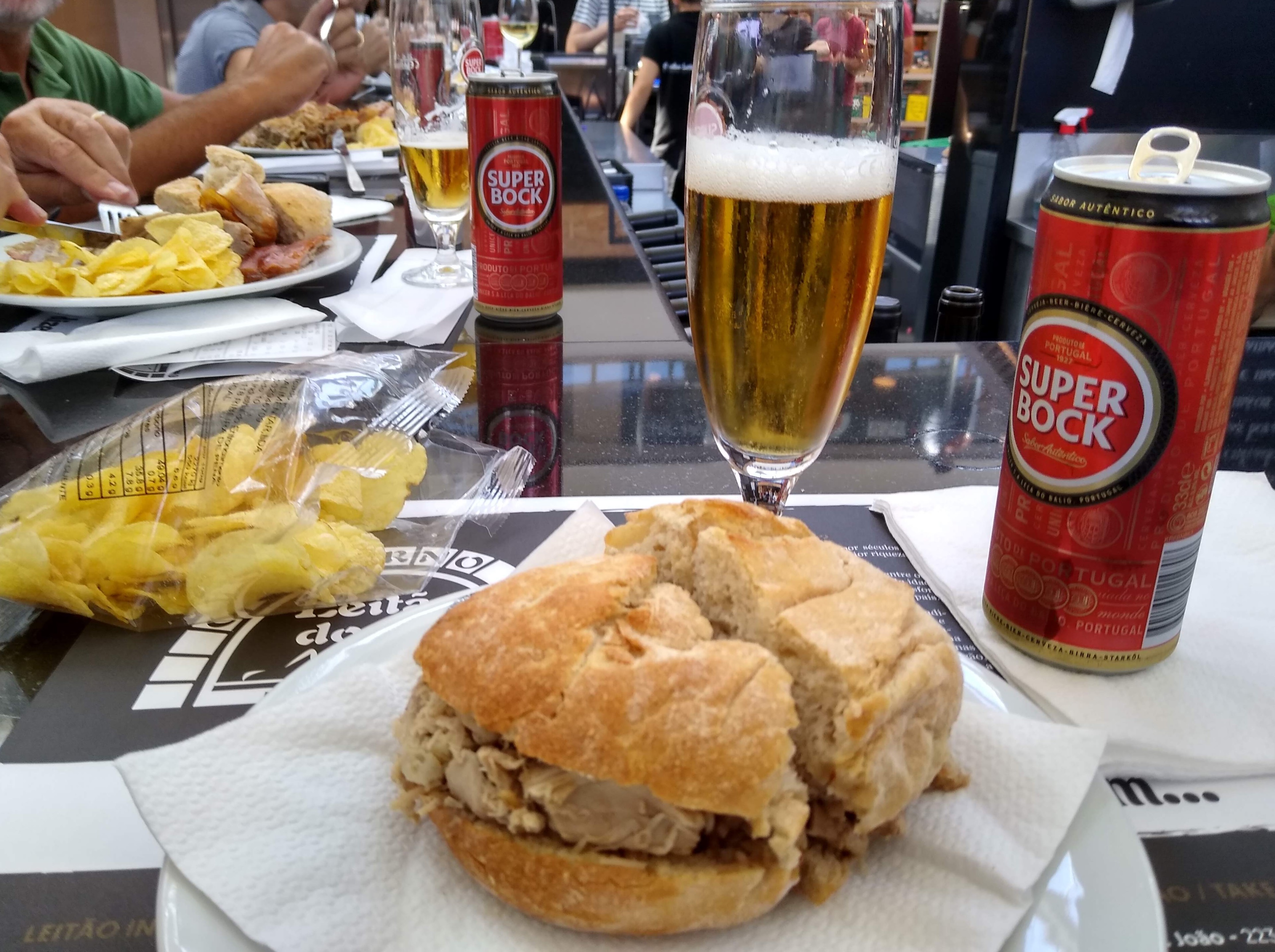 Walking away from the beach we stopped briefly at the Foz Mercado, which will be nice when the building work is finished. The 204 bus took us back into the city to the Boa Vista district to visit the Mercado Bom Successor, a huge concrete market that has been turned into a foodie centre with many different food and drink stalls. It’s a beautiful light airy building, with a great choice of different food styles. Today (as Jessie from the Fast Show would say) we will mostly be eating suckling pig. The pork came in a roll with a bag of crisps on the side and a glass of beer. Boy oh boy was it tasty! Sorry vegetarians, but meat does taste good.