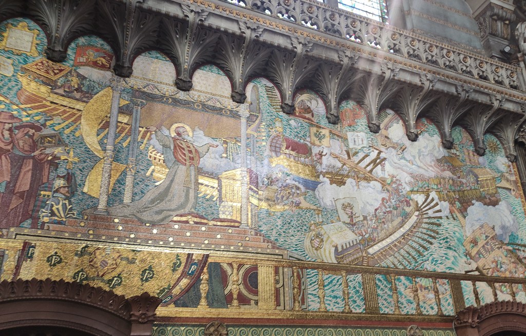 On leaving the station you are right next to the Fourviere Basilica, a magnificent white stone church completed in 1895. The interior is stunning, with huge mosaics highlighted in gold depicting biblical stories and the battle of Lepanto with the French fighting Turks in galleys.