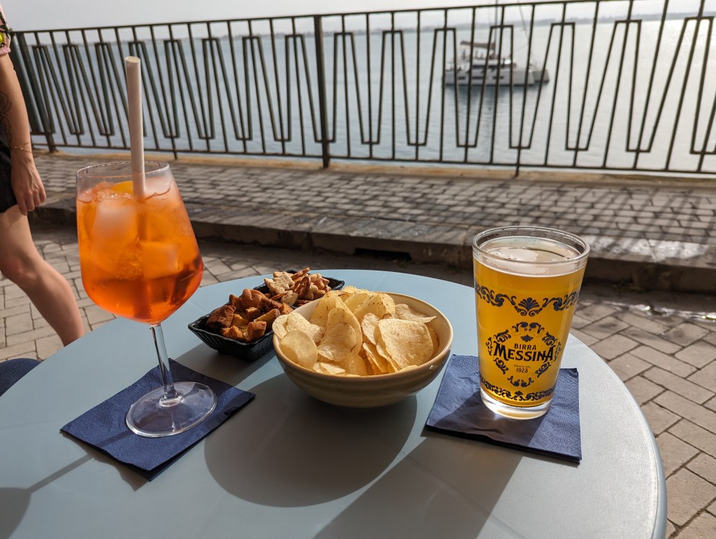 Taormina is a hilltop town between Catania and Messina, famous for being the location of a Netflix show about a glamorous hotel called White Lotus. It is high up on a mountain side with spectacular views of beach resorts beneath it and the Straits of Messina to the north.