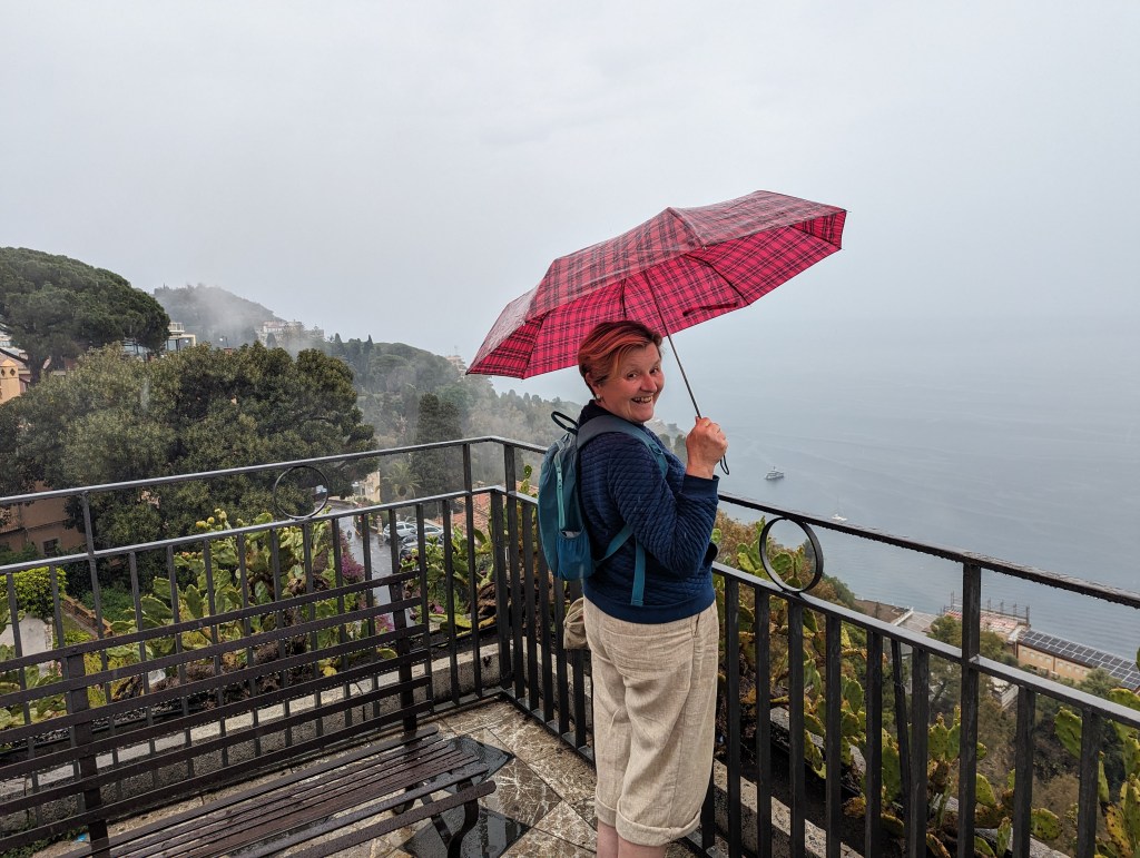 By the time we arrived at the bus terminal it was raining hard, so we sheltered until the worst was over. Our cheap Siracusa umbrellas kept us slightly drier while we walked up to the main street in the town.